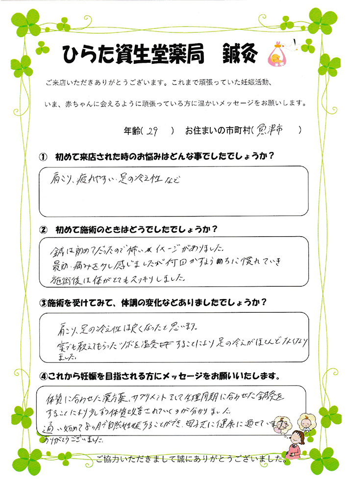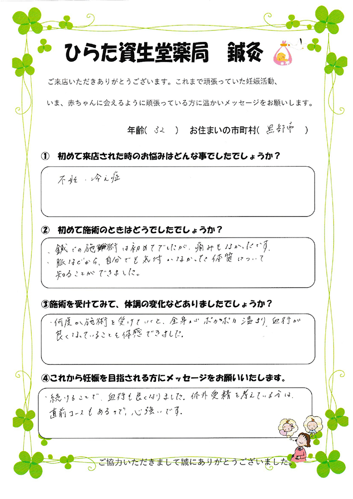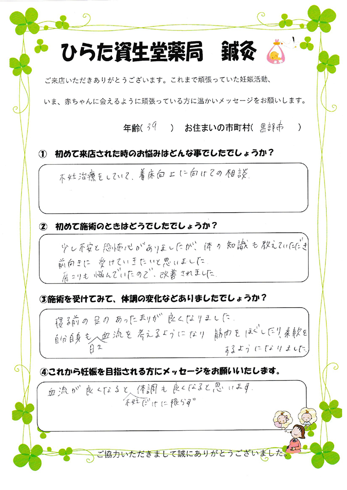 妊娠期間中も片道1時間以上かけて子宝鍼灸に通われ、ご自宅でもケアを続けられました。
